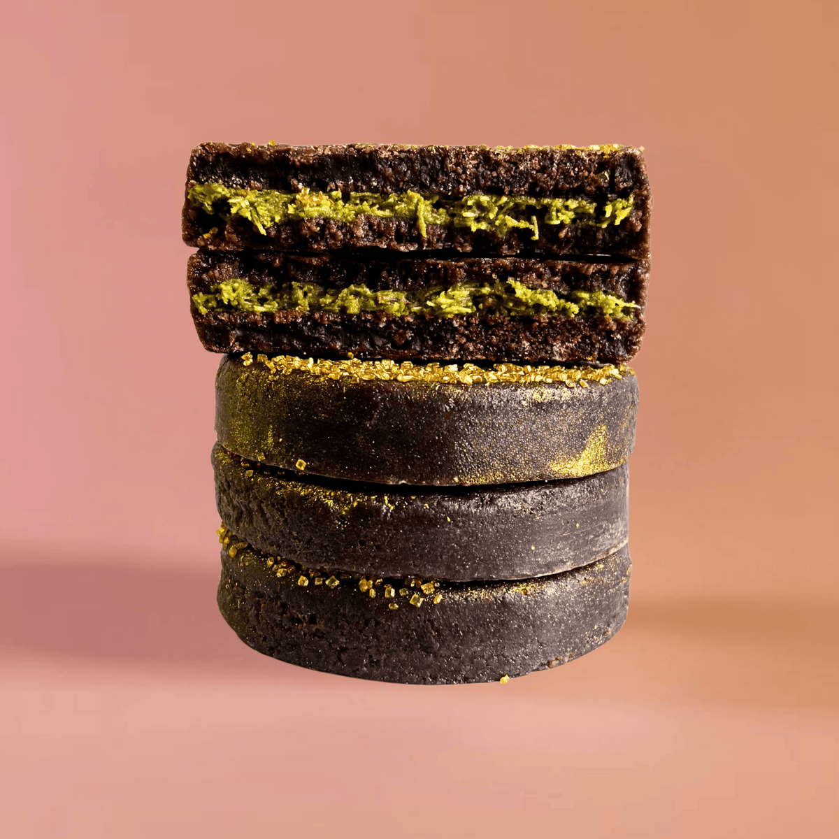 Ingredients: pure cane sugar, premium agar agar, cocoa powder, condensed milk, natural vanilla flavoring, pistachio cream paste (pistachio, milk powder, olive oil, vegetable oil, soy lecithin, cocoa butter), shredded kataifi (wheat flour), lemon extract, edible gold shimmer.